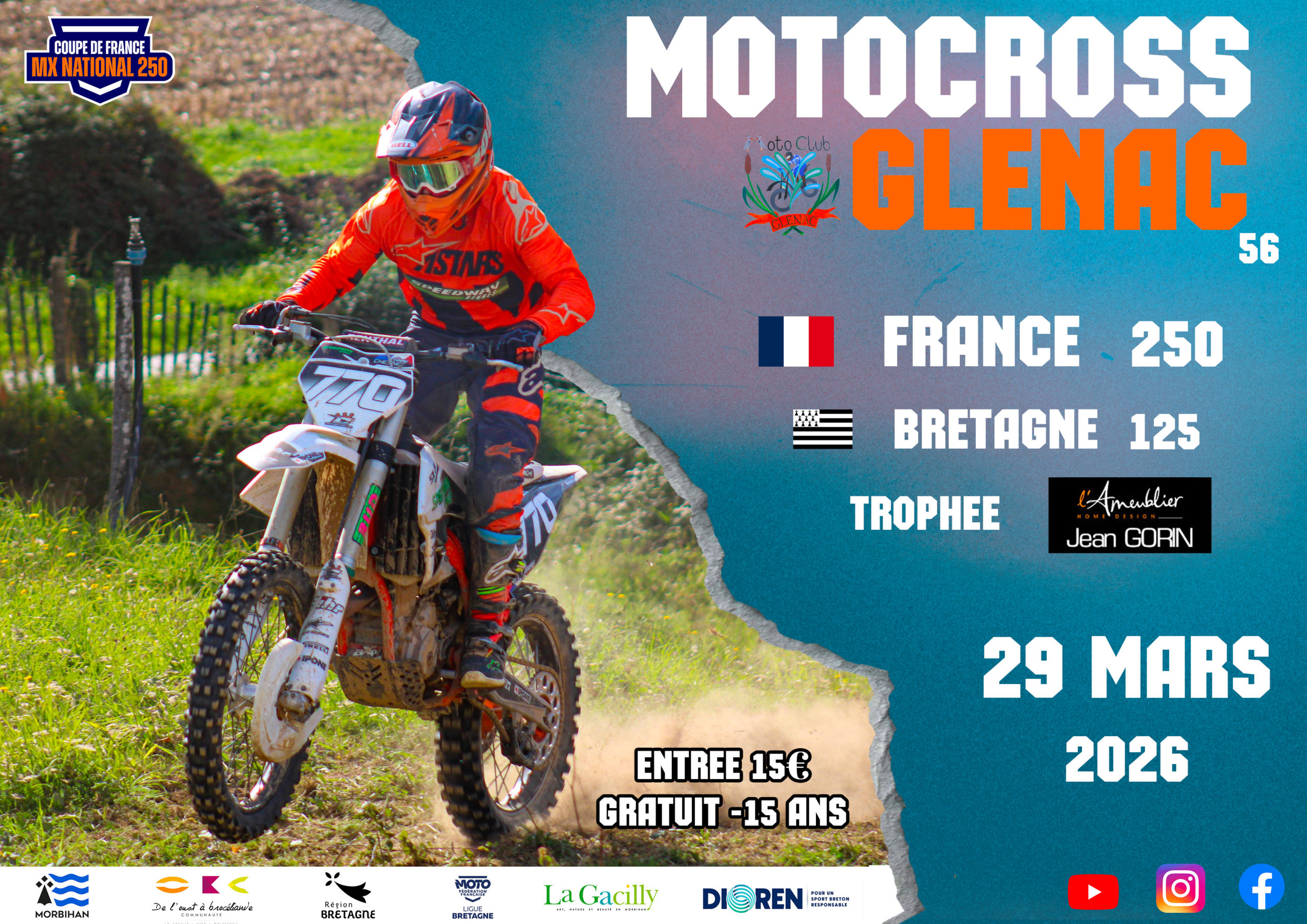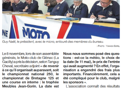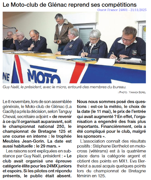 Le Moto-Club de Glénac est une association loi 1901 créée en 1991. Après 2 années passées en UFOLEP, il a très vite intégré la Fédération Française (FFM) pour lui permettre de grandir et faire sa place dans le monde du moto-cross National.
